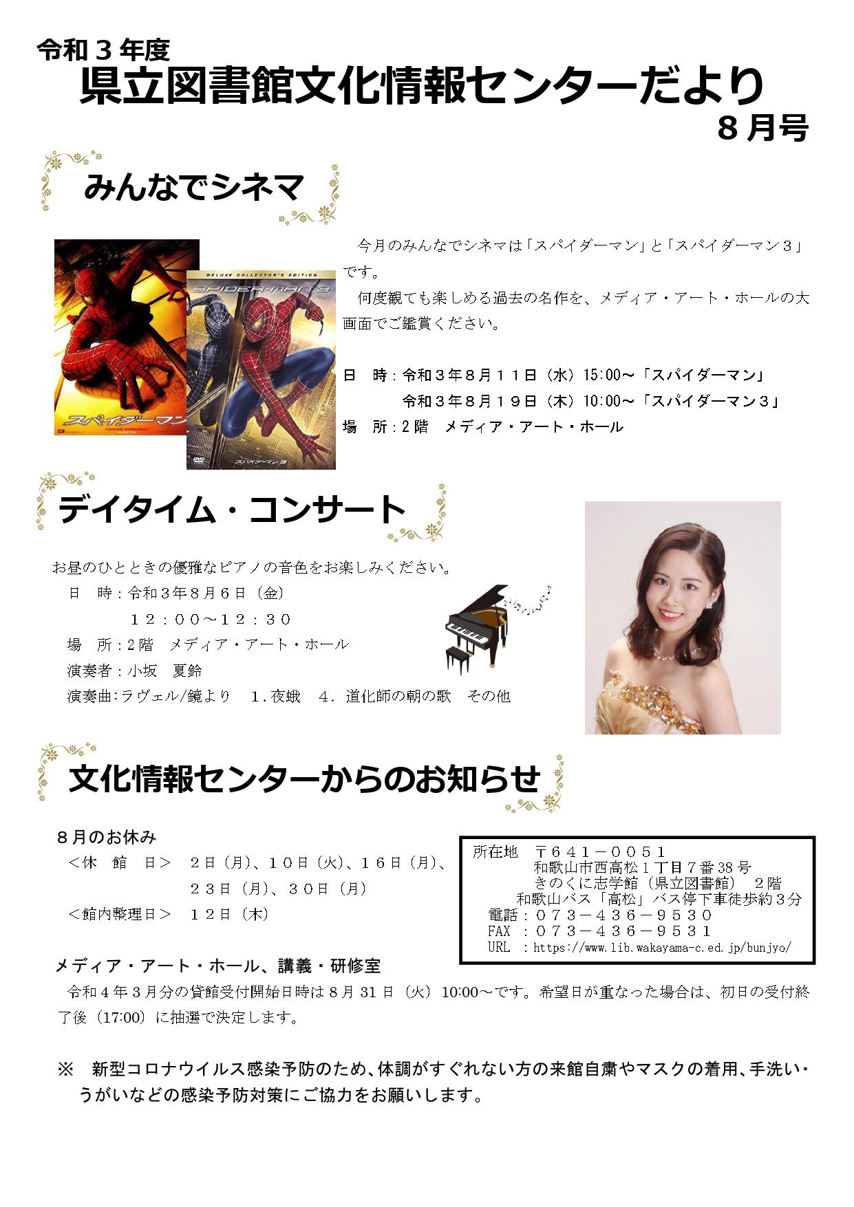 文化情報センターだより8月号を発行しました。 文化情報センターだより8月号を発行しました。 ご来館される際は、引き続き新型コロナウイルス感染予防対策のため、マスクの着用や手洗い、うがい、ソーシャルディスタンスを保って行動いただきますようお願いします。 PDFファイルはこちらからダウンロード可能です。 文化情報センターだより8月号.pdf