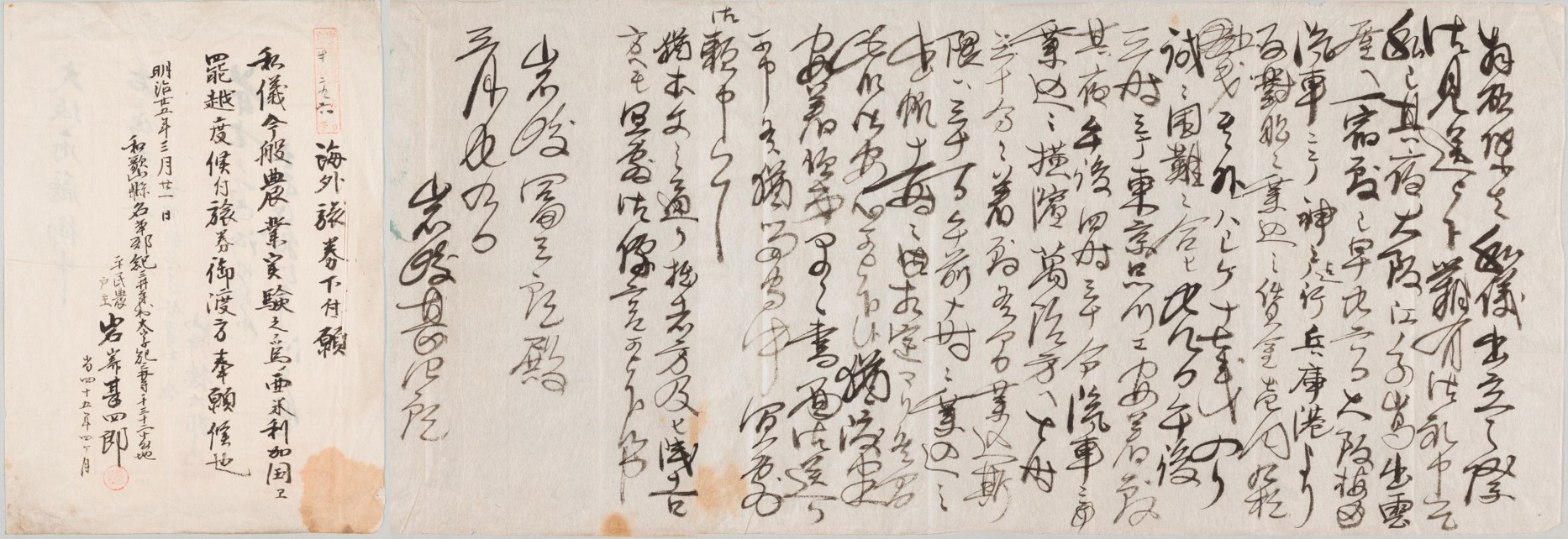 | 明治時代の交通 ―手紙でたどる明治時代の移民1― ※NEW 明治時代に紀三井寺村(現和歌山市)からアメリカ合衆国へと移住する岩﨑甚四郎が大阪府に提出した海外旅券の申請書類と移動途中の横浜から和歌山に暮らす義兄へと送った手紙 |