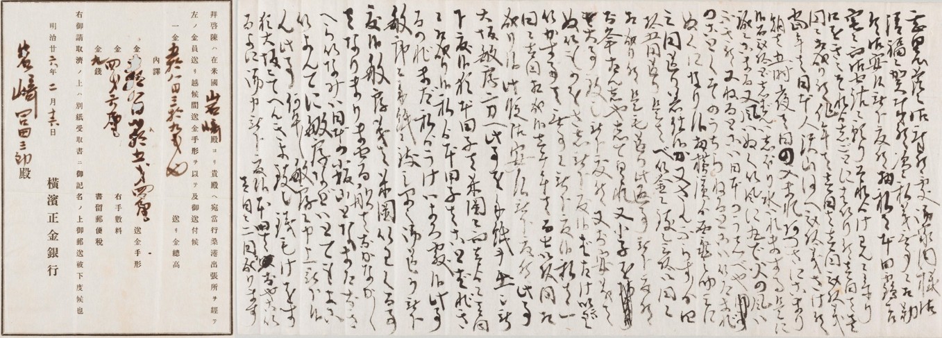 | 日本人移民の労働環境 ―手紙でたどる明治時代の移民3― ※NEW 岩﨑甚四郎がアメリカでの労働環境等を記し、紀三井寺村に暮らす家族に送った手紙と甚四郎が家族に送金したことを知らせる横浜正金銀行発行の通知書 |